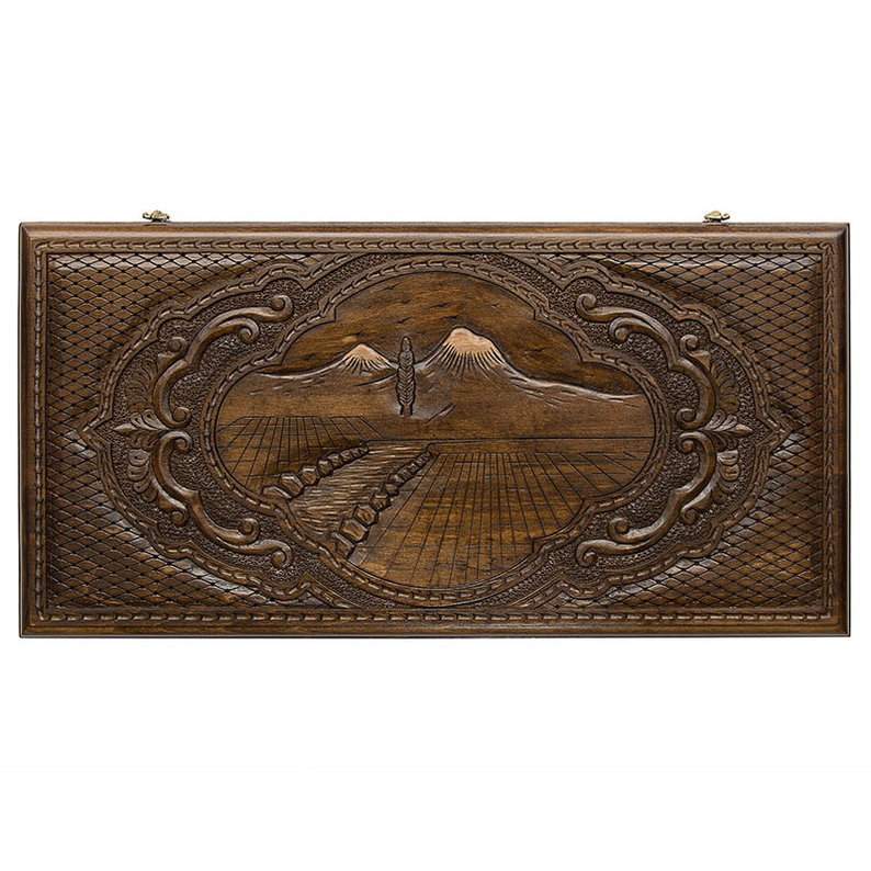 На лицевой поверхности вырезано изображение Гор Арарата, перед которыми раскинулось поле, окруженное деревьями. Вокруг картинки выполнен привлекательный узор, а ближе к бокалам нанесена фигурная сеточка. На противоположной стороне имеется поле для игры в шашки или шахматы, также окруженное различными узорами и сеткой. В центральной части обеих створок, с внутренней стороны, вырезаны виноградные кисточки. Ячейки подчеркиваются контрастным узором. Также по бокам присутствует ложбинка, предназначенная для складывания фишек, когда они выводятся ближе к концу партии.