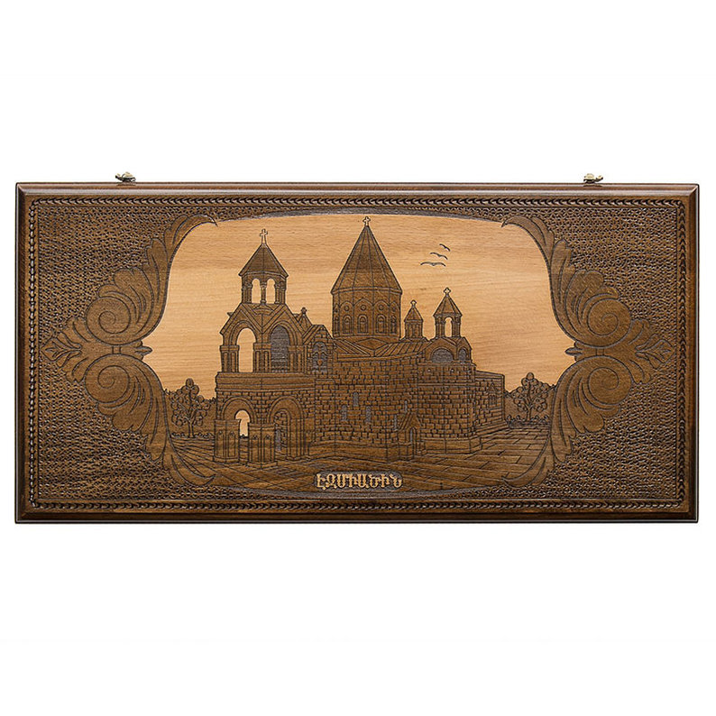Доска выполнена в стандартном форм-факторе. На лицевой поверхности вырезан эчмиадзинский монастырь, а в свободных местах выполнена фактурная резьба. С задней стороны предусмотрено поле для шашек и шахмат, также окруженное резьбой. В центре внутренних поверхностей имеется круглый узор с множеством мелких элементов. Каждая ячейка подчеркивается узорами в форме вытянутой капли. На крючке имеется изображение эмблемы производителя.