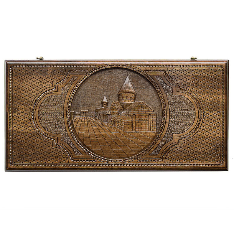 Доска по форме стандартная – прямоугольная, размером 60х60 см. На одной из поверхностей имеется изображением храма Гарни, а на второй расположился монастырь Гегард. В обоих случаях используется ручная резьба в объемном виде, выполненная с максимальной детализацией. Оставшееся свободное пространство занимает рифление и геометрический узор в форме ромбов. Внутренняя поверхность украшается вырезанной кистью винограда в средней части и каплевидными узорами по бокам, отходящими от каждой ячейки. С боков предусмотрены ложбинки, куда можно складывать фишки после того, как они выходят из игры. Петли вылиты в уникальной форме, как и крючки, но на последних еще имеется эмблема производителя.