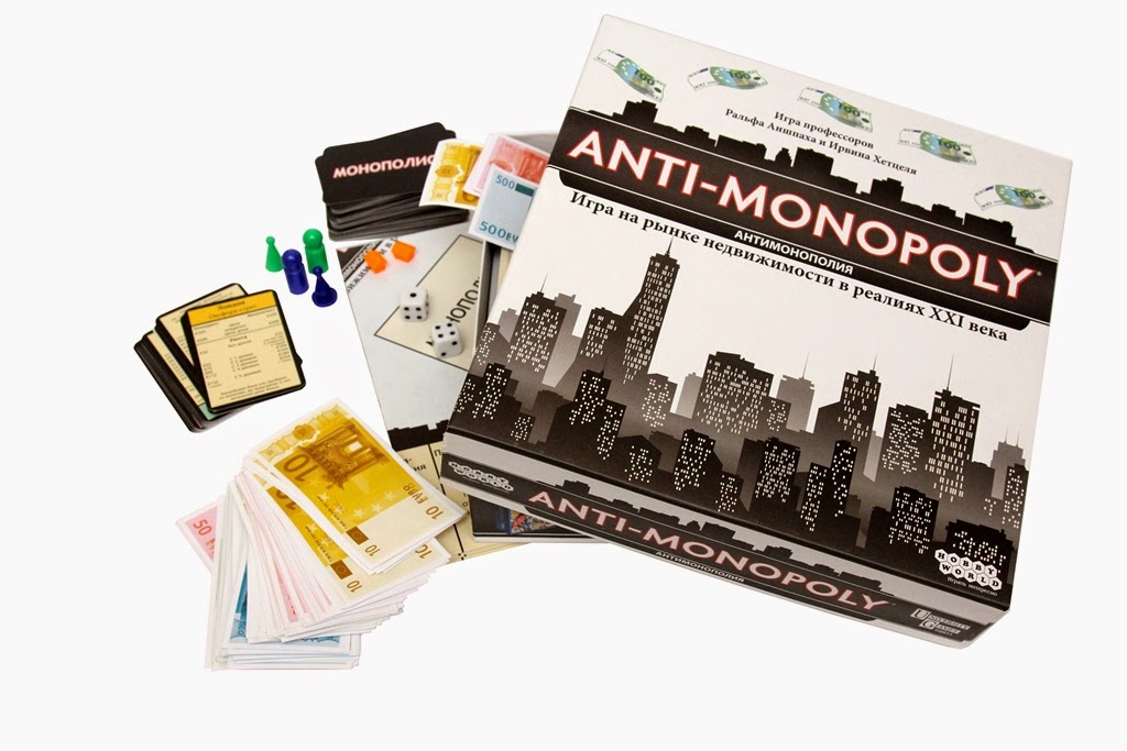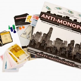 «Антимонополия» — другой взгляд на «Монополию», созданную почти век назад. Сюжет взят из заголовков современных газет: мелкие предприниматели пытаются выжить в неравной борьбе с безжалостными монополистами. В мире реального бизнеса все участники рынка борются за прибыль, но добиваются её разными путями. Конкуренты сдерживают цены, чтобы получить доход за счёт объёма продаж, а монополисты уничтожают конкурентов, чтобы потом уже завысить цены, как им угодно.