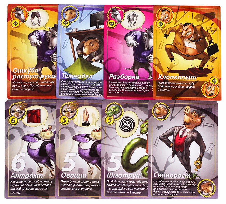 Новое издание российского карточного бестселлера добавляет в игру ещё больше карт, ещё больше животных и ещё больше веселья. На помощь классическим свиньям пришли чопорные змеи, гламурные попугаи и задиристые собаки. С помощью этих карт вы сможете составить свою неповторимую игровую колоду, идеально подходящую именно для вашей компании. Цель игры осталась прежней — избавиться от всех своих карт. А средств достижения победы хоть отбавляй: заморочьте голову противника Предписаниями, заставьте его подчиняться правилам Этикета, сломите его Вызовом на карточную дуэль и поглумитесь в назидание при помощи карт Куража.