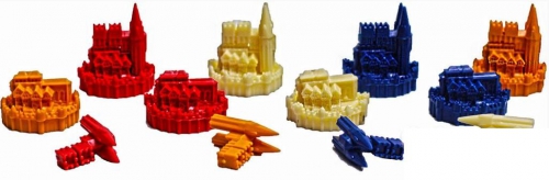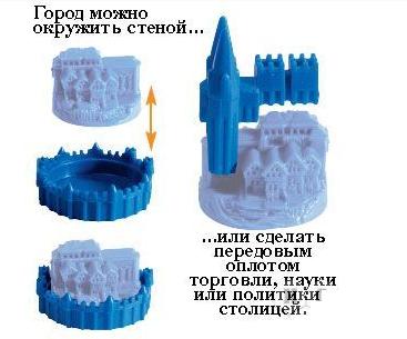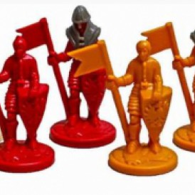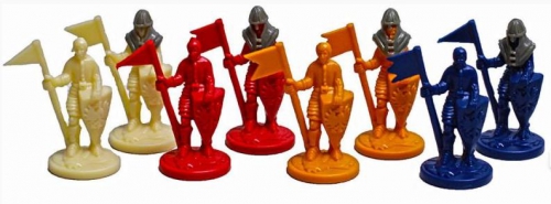 Комплект игровых фигур: 4 шт, в каждом комплекте 6 рыцарей, 6 шлемов, 3 городские стены, 3 насадки столиц.