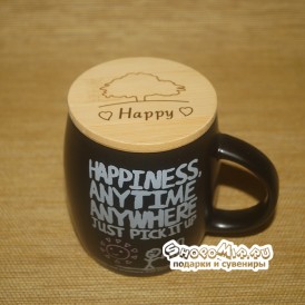 А пока вы будете с упоением предаваться сказочным мечтам, деревянная крышка не позволит напитку остыть. И лишь утонченный аромат будет легко сочиться сквозь тонкий кружок с пожеланием счастья. Также деревянная крышка может выполнять роль подставки.