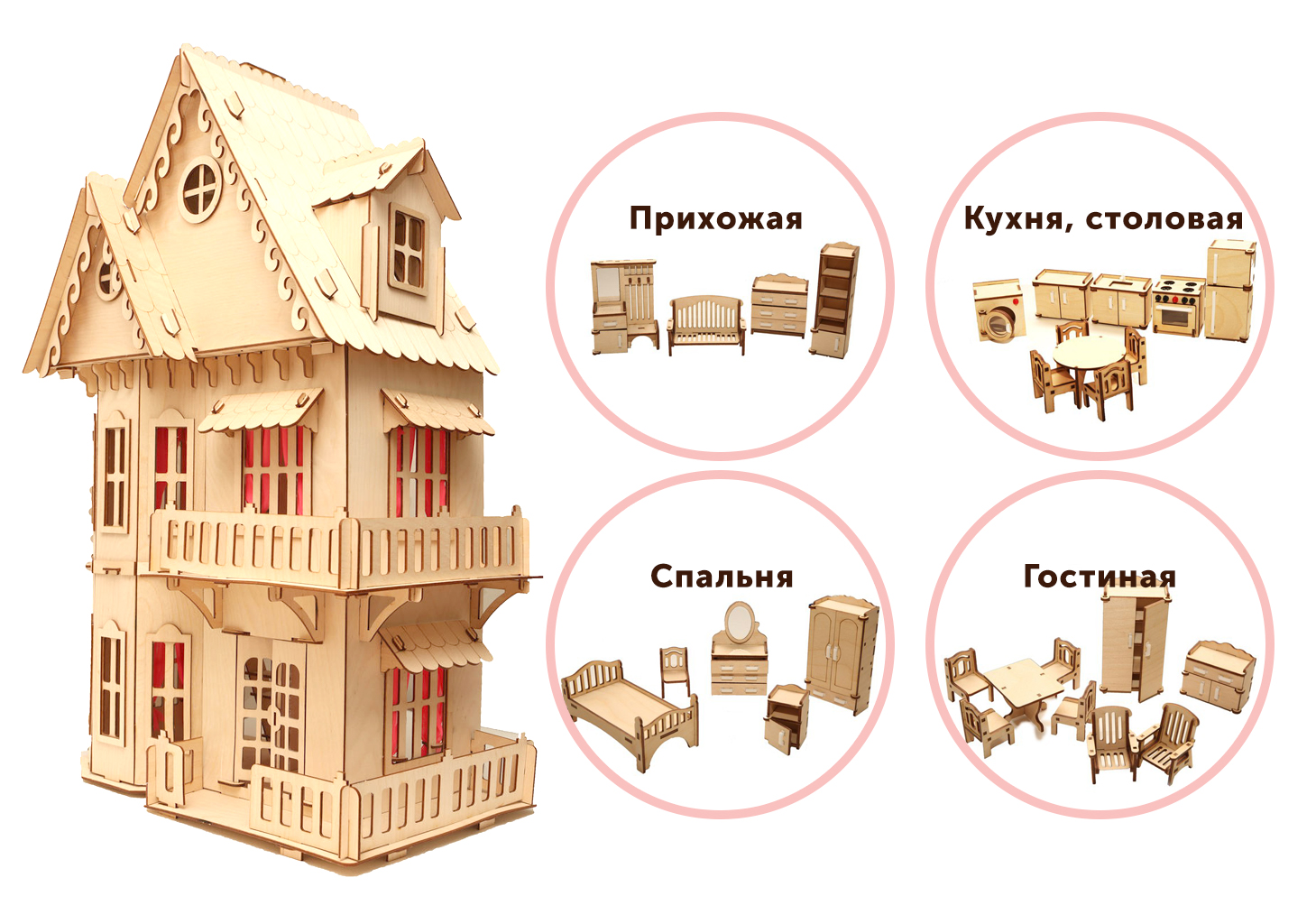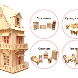 Трехэтажный дом для кукол состоит из шести комнат: зал, ванная, спальня, прихожая, туалет и детская. Резная крыша, лестница на каждый этаж, гардины и занавески в комплекте. Домик не раскрашен, пусть ваш ребенок будет дизайнером и придумает все сам. А мама сошьет самый настоящий текстиль для домика, но только в миниатюре.