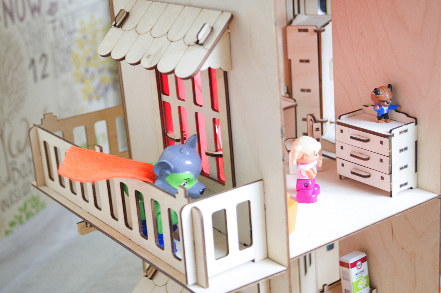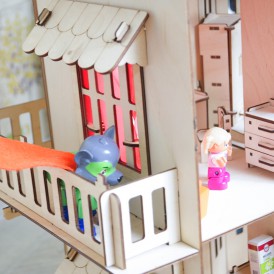 При сборке детали соединяются между собой, как конструктор в пазы. После сборки дом можно покрасить или покрыть лаком и даже поклеить обои, прекрасное "поле" для творчества.