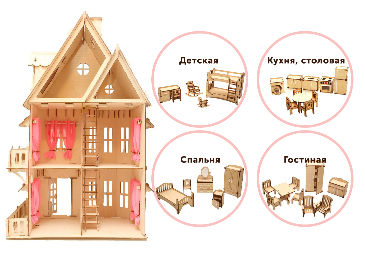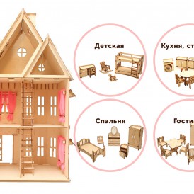 Кукольный домик с мебелью состоит из 3-х этажей и шести комнат: зал, ванная, спальня, прихожая, туалет и детская. Резаная крыша, лестница на каждый этаж, шторки в комплекте - разве не чудо!