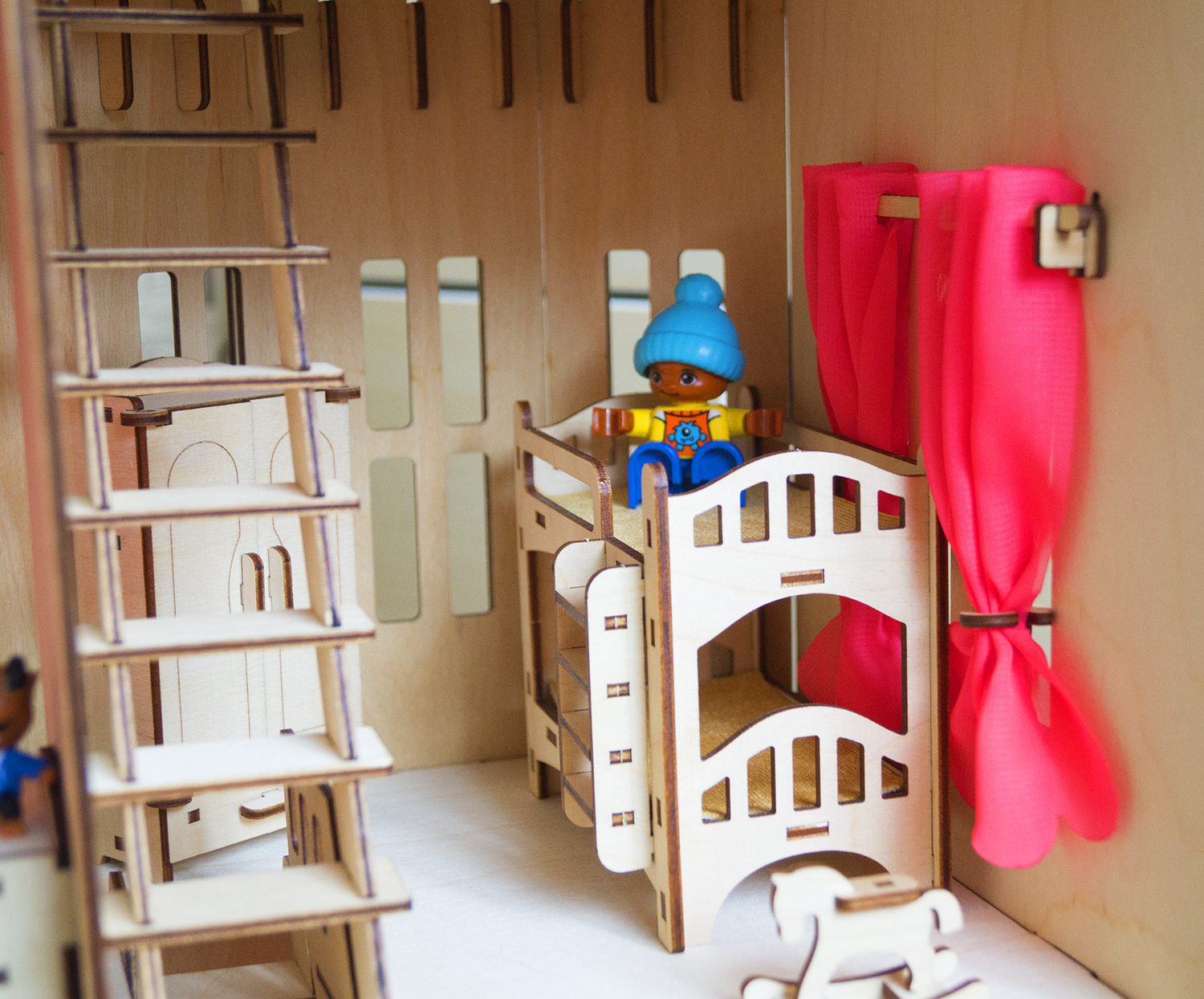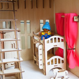 При сборке детали соединяются между собой, как конструктор в пазы. После сборки дом можно покрасить или покрыть лаком и даже поклеить обои, прекрасное "поле" для творчества.