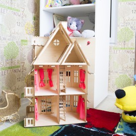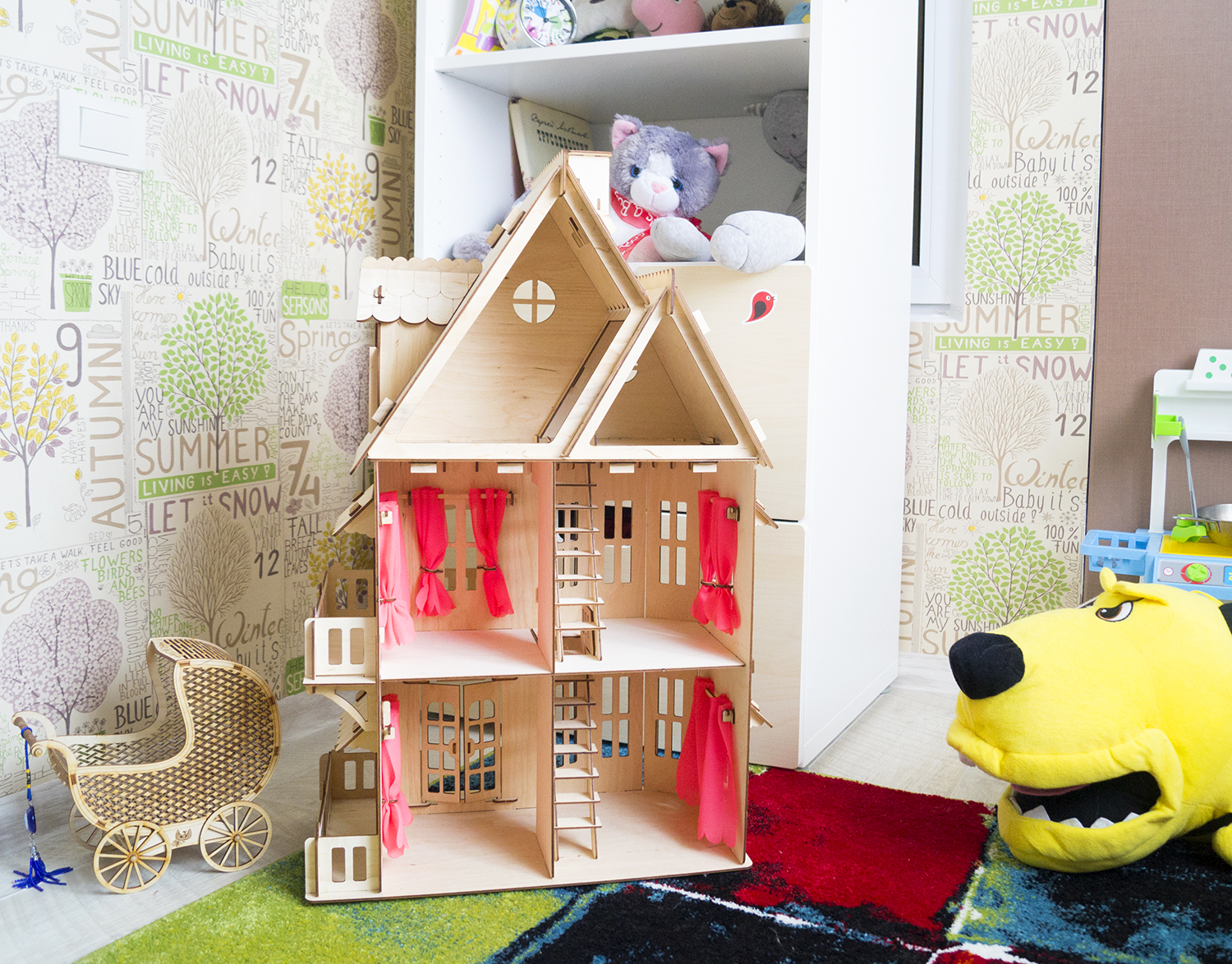 Фанерный домик для кукол 76 см состоит из 3-х этажей и шести комнат: зал, ванная, спальня, прихожая, туалет и детская. Резная крыша, лестница на каждый этаж, занавески в подарок!