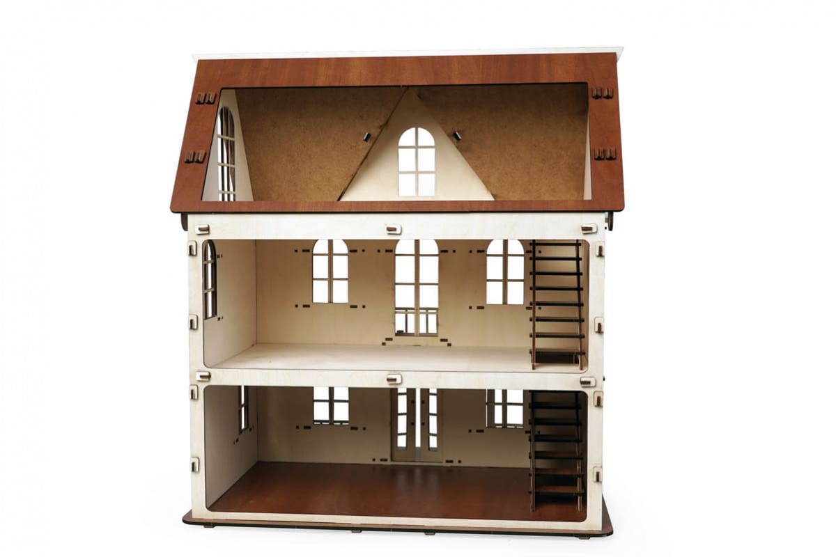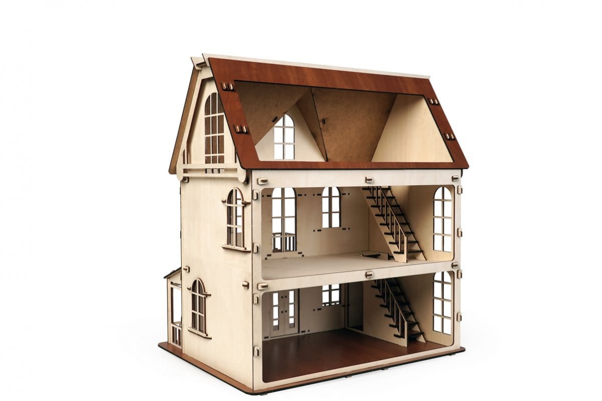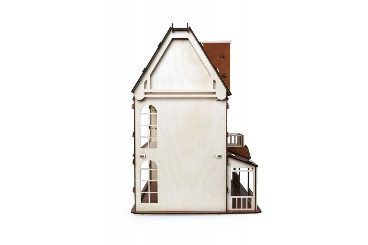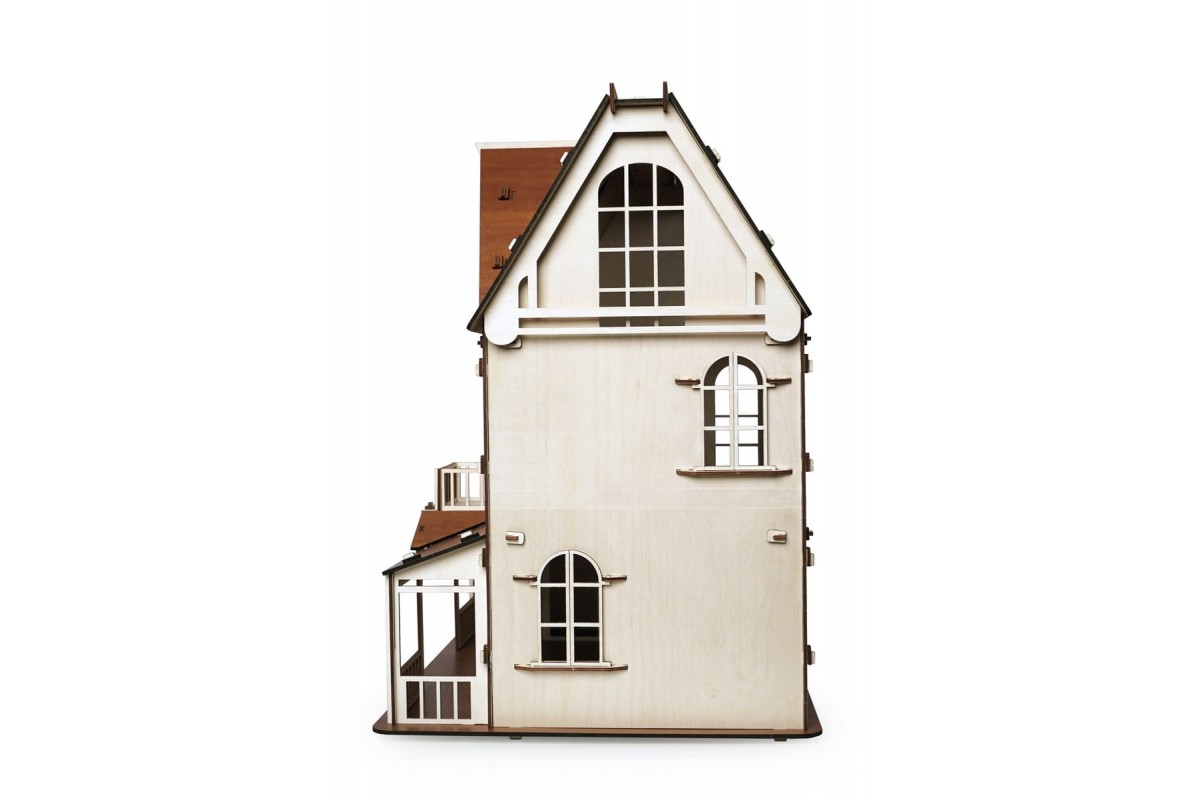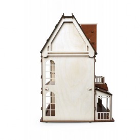 Изящный дом состоит из 2-х этажей и мансарды. Две лестницы на каждый этаж, фигурные окна с затейлевыми вензелями, темный пол и крыша - разве не чудо!