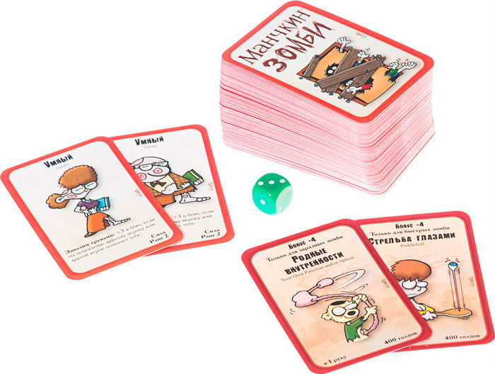 Манчкин. Зомби рассчитан на компанию от трёх до шести человек. В коробке вы найдёте 112 карт, подробные правила игры и кубик для смывки. Не любите фильмы ужасов? Мы уверены, что динамика, великолепный юмор и графика заставят вас по-настоящему полюбить зомби!