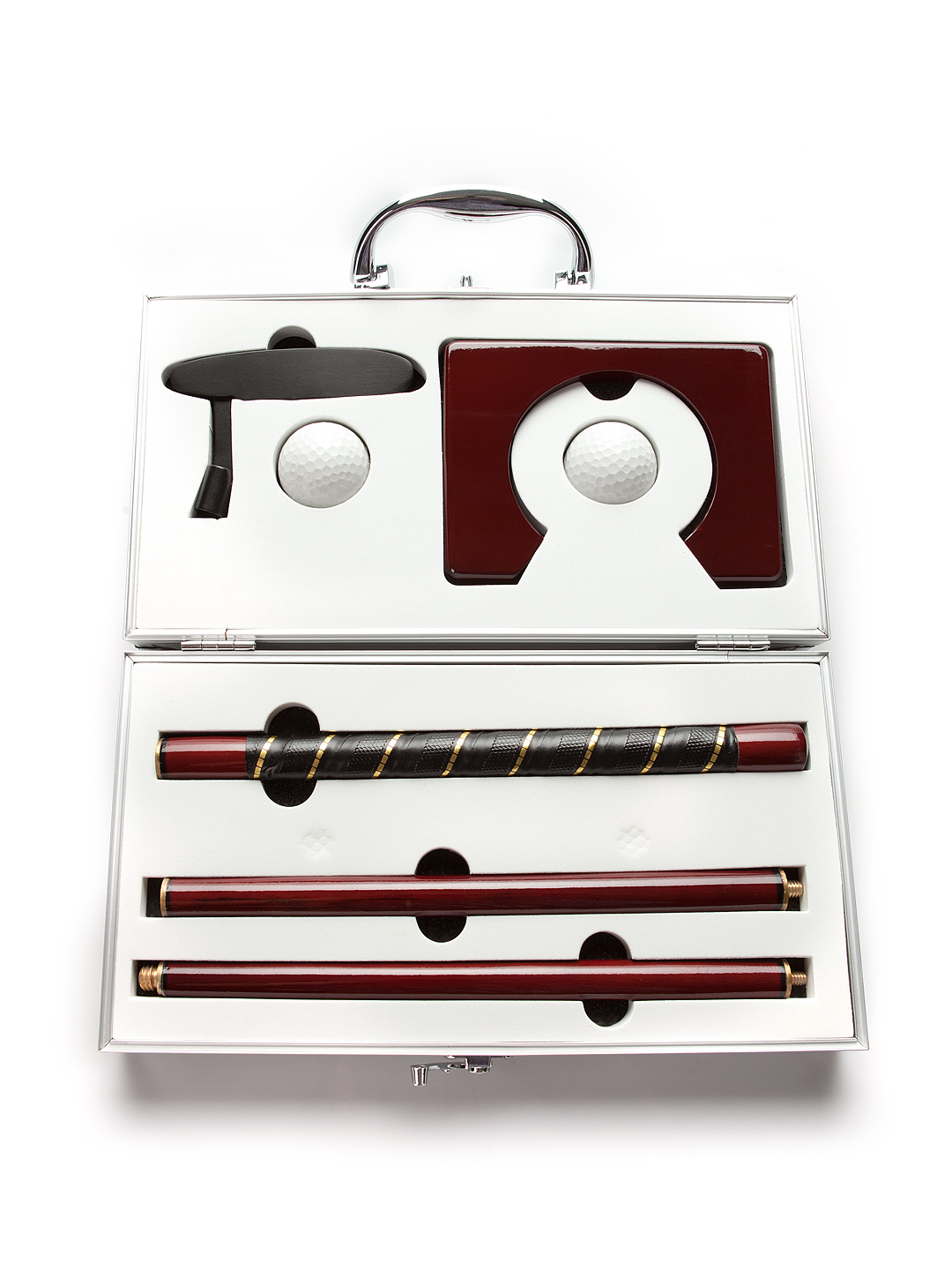 Если Вы решили собраться с друзьями на природе или просто не знаете чем заняться в свободное от всех дел время, тогда представляем Вашему вниманию набор для игры в гольф!В небольшом алюминиевом кейсе, куда помещаются все необходимые принадлежности, есть большое преимущество – Вы всегда можете брать мини-гольф с собой, ведь он оснащён удобной ручкой. Поэтому офисный гольф легко становится просто мини-гольфом.Чтобы приступить к игре, необходимо всего лишь скрутить клюшку, которая состоит из 3-х частей, и положить лунку на пол.Купить