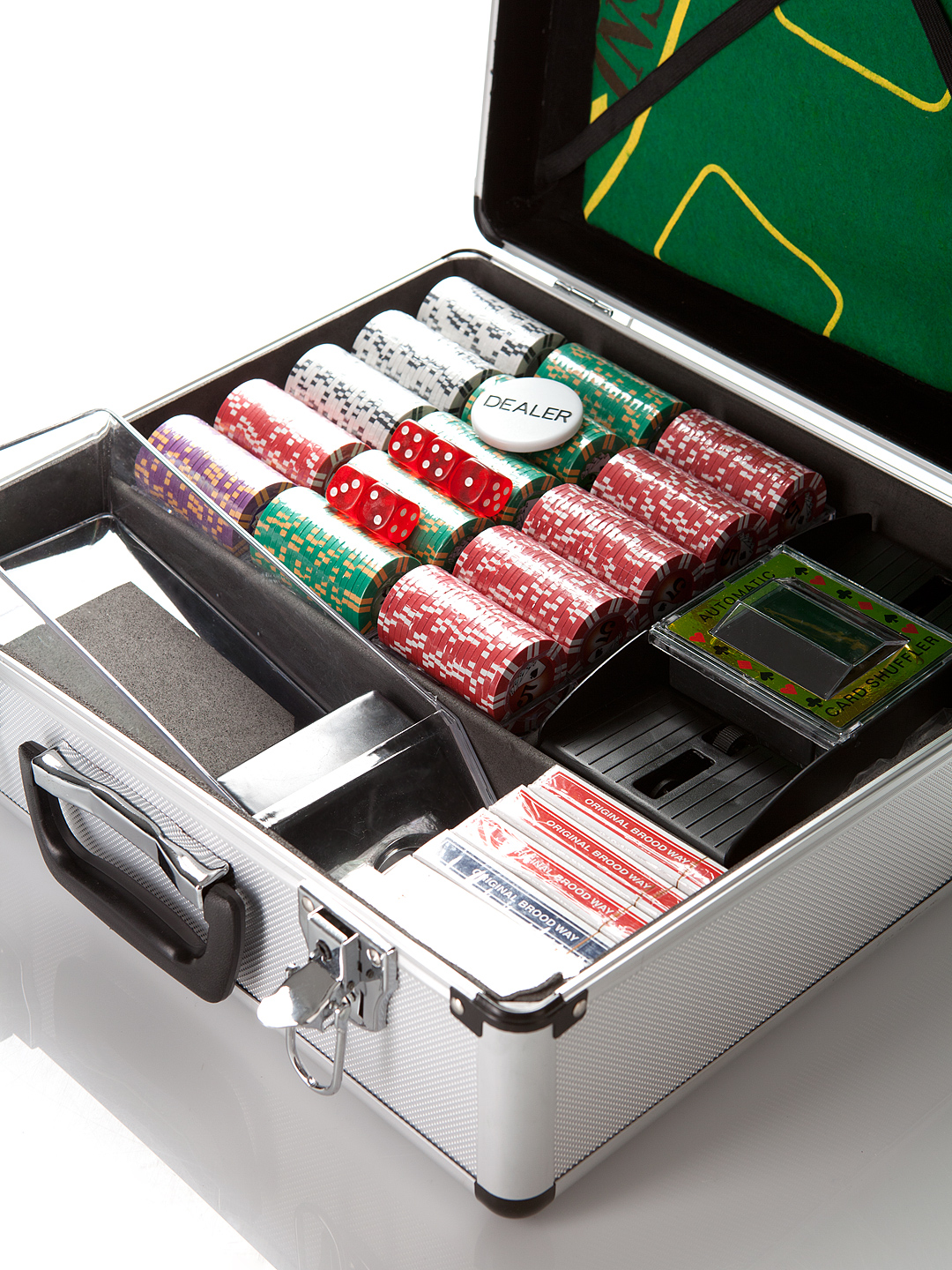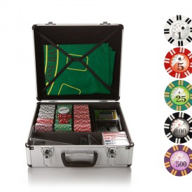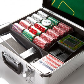 Набор для покера и блэк-джека All-inRoyalFlushподарит вам незабываемые ощущения. Помимо самих фишек, здесь есть акриловые подставки под них, 6 колод великолепных игральных карт, кнопка дилера, а также удобная шафл-машинка для перемешивания карт и башмак для их раздачи.