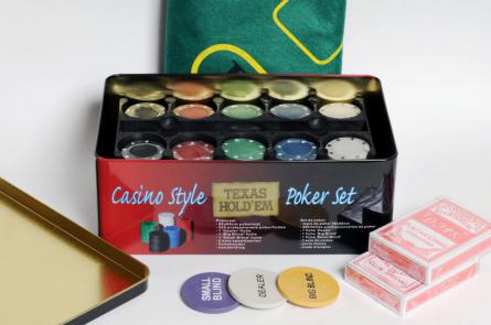 Набор для игры в покер содержит всё необходимое для качественно проведённых партий. 200 фишек без номинала, фишка дилера, сукно и карты, которые так приятно держать в руках, сложены аккуратно в жестяную банку с крышкой, поэтому брать куда-либо покерный набор не составляет труда.