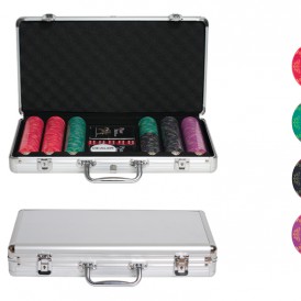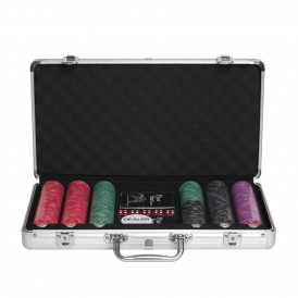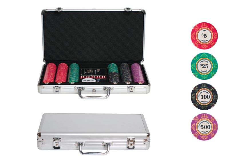Комплект рассчитан на компанию из 2-8 человек. В набор входит 300 керамических фишек различного номинала: 5 (100штук),25 (75штук), 100 (75штук) и 500 (50штук), 2 колоды пластиковых карт (по 54 листа в каждой) и 5 игральных костей. Комплектующие хранятся в изящном компактном металлической кейсе. Вес набора – 4,260кг, поэтому вы сможете с легкостью взять его с собой, если собираетесь в гости, на природу или дальнюю поездку.