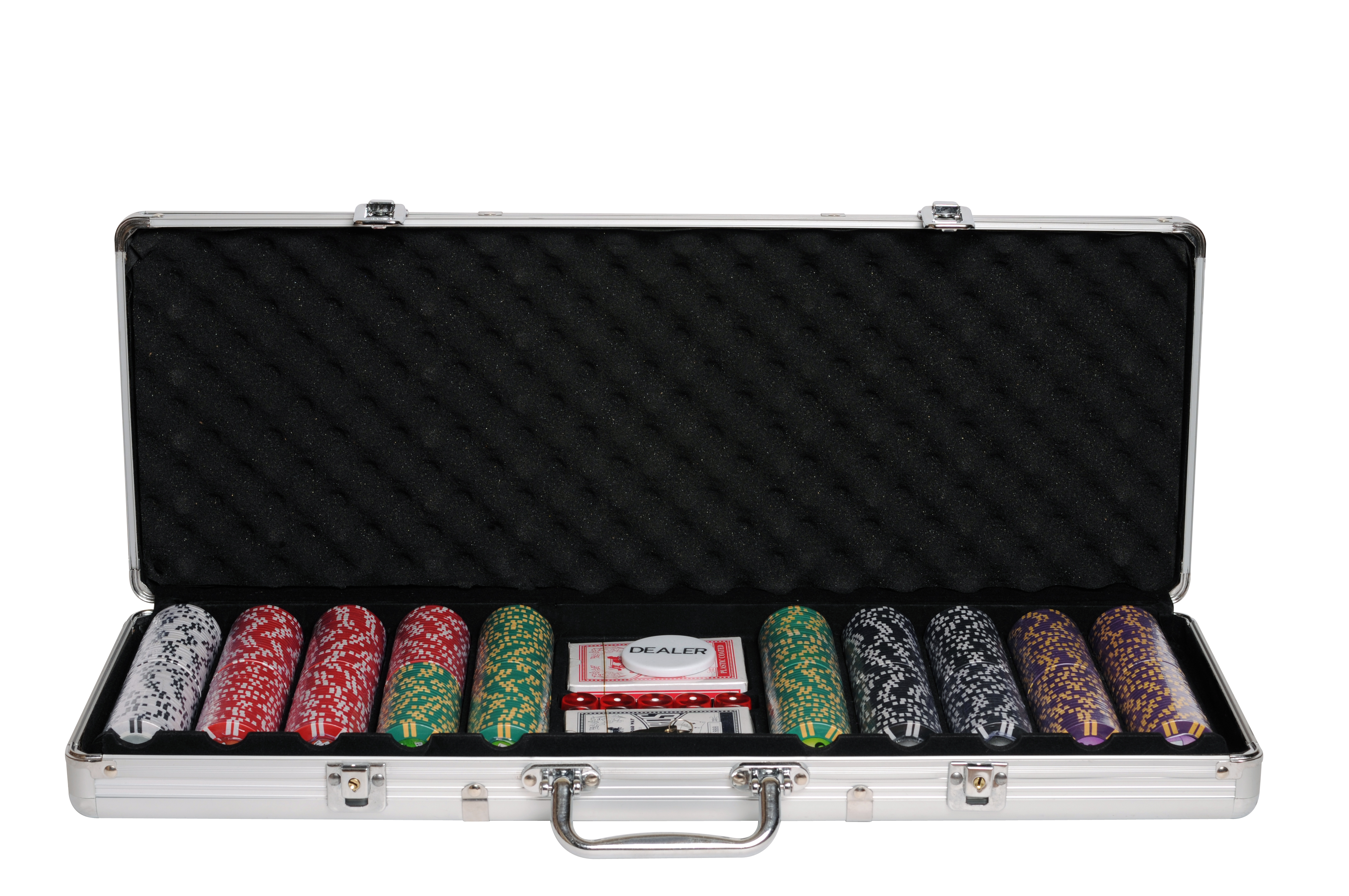 Не стоит отказывать себе в удовольствии играть дома, в гостях или на отдыхе! Представляем Вашему вниманию покерный набор на 500 фишек Royal Flush. В стальном кейсе Вы найдёте всё, что необходимо для полноценной игры: 500 фишек разных номиналов, фишку дилера, 5 игральных костей и 2 колоды карт.