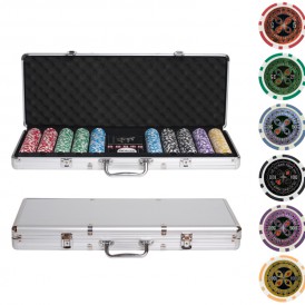 Этот набор для покера на 500 фишек станет отличным решением для вас, если вы любите получать оптимальное качество. Здесь вы найдете фишки с различными номиналами (от 5 до 1000), фишку дилера, игральные кости, а также 2 колоды карт отличного качества из 100% пластика.