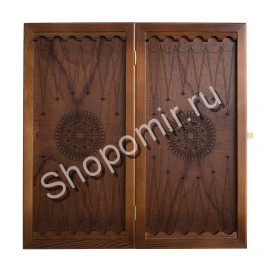 Внутренняя сторона, являющаяся игральным полем, украшена резным геометрическим узором, который имитирует восточные символы небесных тел. Фишки с декоративной резьбой выполнены в том же стиле и создают полностью законченную картину.