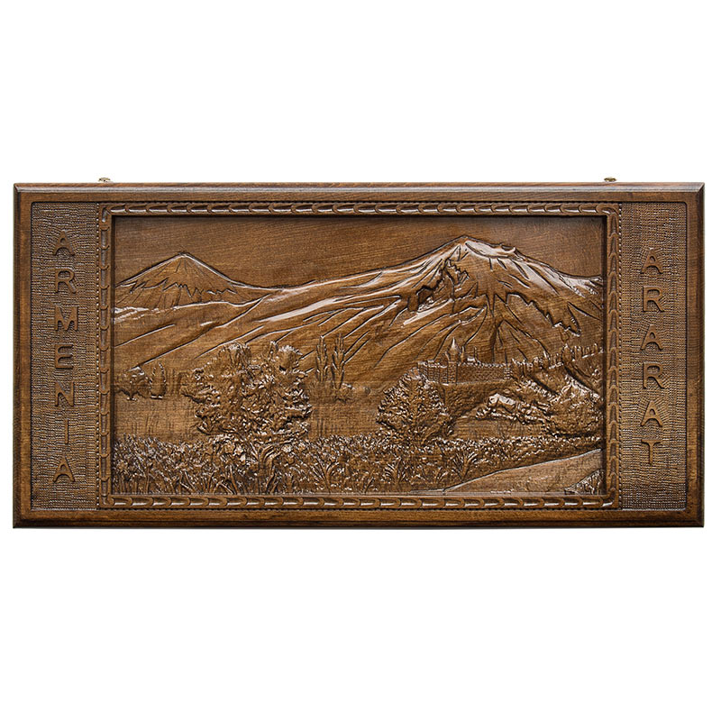 На лицевой стороне вырезан целый пейзаж – на фоне высоких, заснеженных гор, расположилась крепость с башнями, а перед ней раскинулась зеленая Араратская Долина. Когда смотришь на нее, так и хочется собрать вещи и отправиться отдыхать в эти края. Мастер не забыл добавить поле для шашек, которое расположилось на задней стороне. Изнутри, по центру, вырезан символ солнца, от которого отходят лучи к ячейкам. На них, кстати, выполнено мелкое рифление, что является не украшением, но и повышает удобство при игре.