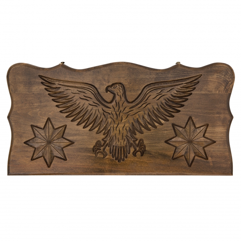 Лицевая сторона верхней части украшена вырезанным изображением орла, гордо расправившего крылья, а также двумя Розами Ветров. На задней стороне верха нанесено поле для игры в шашки. Партии в эту игру можно проводить с помощью 32 двухцветных фишек, идущих в комплекте. Их же можно использовать для нард. Верхняя часть доски полностью покрыта несколькими слоями защитного лака, придающего особую прочность и великолепный внешний вид, блеск.