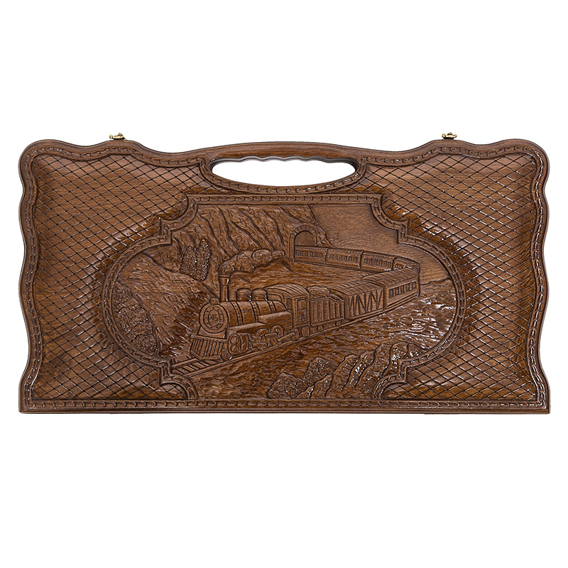 стороне вырезана ручка, оборудованная отверстиями для пальцев – она позволяет удобно брать рукой и переносить. Лицевая поверхность украшается изображением поезда, выезжающего из тоннеля, вырытого прямо в скале. Внутри узор наносится на каждую отдельную ячейку. Даже бронзовые петли выполнены нестандартно – необычная форма и эмблема производителя. Есть также специальное поле для игры в шашки, которое находится на обратной стороне доски.