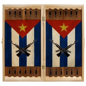 Такой подарок определенно является подарком класса Люкс. Он подойдет как взрослому зрелому мужчине, так и молодому успешному человеку. Изящный рисунок, тонкое окрашивание, все в этой игре говорит о высоком статусе. Игра выполнена из высококачественного дуба. В набор входят: 16 темных шашек, 16 светлых шашек, кости 2 шт. Вес игры внушительный 3970гр. Размеры: 60*30*6см. Производство Россия. На внутренней части платформы игры изображен флаг Кубы с автоматами, а так же гильзы. Это окрашивание ручной работы с нанесенной сверху защитной проклейкой.
