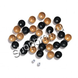 Игральное поле имеет лаконичный геометрический узор, подчёркивающий лузы по периметру. По краям поля расположены специальные карманы с ячейками для хранения фигур. В комплект входят два вида фишек из дерева тёмного и светлого оттенка и две игральные кости.