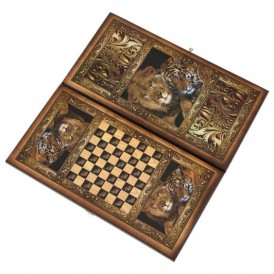 Нарды “Сирия львы” большие рассказывают нам об исторической родине нард - Индии. Изображение льва и тигра имеют особое значение в культуре этой страны: лев - обозначает отвагу и мудрость, образ тигра, священного животного, символизирует живость ума и выносливость. Композицию завершает обрамление золотистым узором. Акриловые краски, которыми выполнен рисунок, надолго сохранят яркость и не утратят цвет с течением времени.