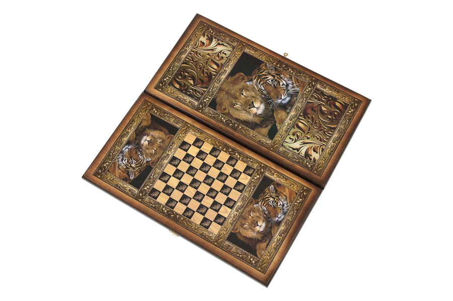 Нарды “Сирия Львы” средние напоминают нам об исторической родине нард - Индии. Центральный рисунок доски изображает льва и тигра. Эти животные имеют особое значение в индийской культуре: лев - символ отваги и мудрости; образ тигра, священного животного, обозначает живость ума и выносливость. Рисунок обрамлён золотистым узором, который завершает композицию.