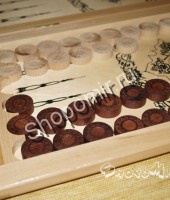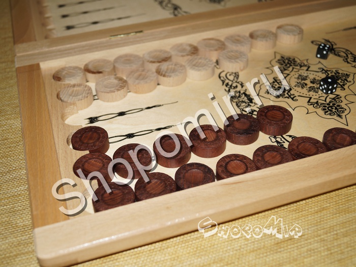 Дополнительный бонус в этом наборе – на обратной стороне игровой доски расчерчены поля, позволяющие играть на ней ещё и в шашки, что особо ценно для азартных игроков, ценящих компактные наборы игр.
