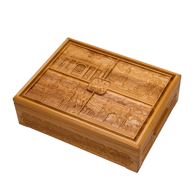 В красивой коробочке скрывается полноценный набор для игры в лото, сделанный из благородного ясеня. Уже при взгляде него становится понятно, что изделие относится к высшей категории, нас тут изысканное оформление и резьба. На верхней крышке вырезаны сразу 4 российские достопримечательности, причем детализация находится на отличном уровне. Древесная фактура подчеркнута лаком, придающим изысканного блеска. На боковых поверхностях также имеется замысловатый мелкий узор. На левой и правой сторонах предусмотрены ручки, за которые удобно будет переносить коробку.