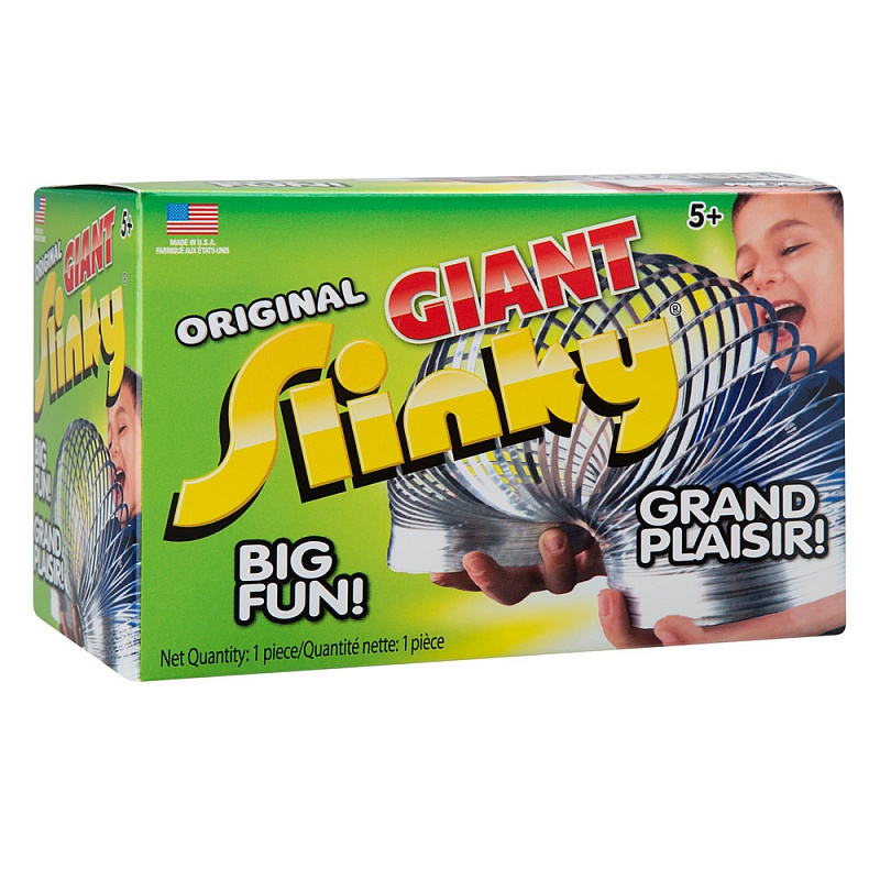 Пружинка, или Slinky, – самая популярная и любимая игрушка среди детей и взрослых. Она может быть выпущена из металла или цветного пластика. Обычно металлические варианты пружинки также могут иметь яркий окрас, но вот гигантская «слинки» продается в неокрашенном виде, как в оригинале. Игрушка была создана не только для развлечения, но и для успокоения нервов. Несмотря на то, что впервые она появилась в Америке, игрушка крепко заняла лидерские позиции в России в 90х годах. Слинки можно перекатывать из одной руки в другую, сооружать из подручных предметов ей ступень или просто играть. Игрушка развивает мелкую моторику рук. Данный вариант пружинки самый большой. Слинки отлично тянется и перекатывается. Шаги, правда, у такой версии значительно больше, чем у обычной. Кстати, игрушка уже выпускается около 60 лет. И заслужила любовь как детей, так и их родителей. Пружинки «Slinky» – неотъемлемый атрибут в игротеке любителя настольных игр и подобных развлечений.