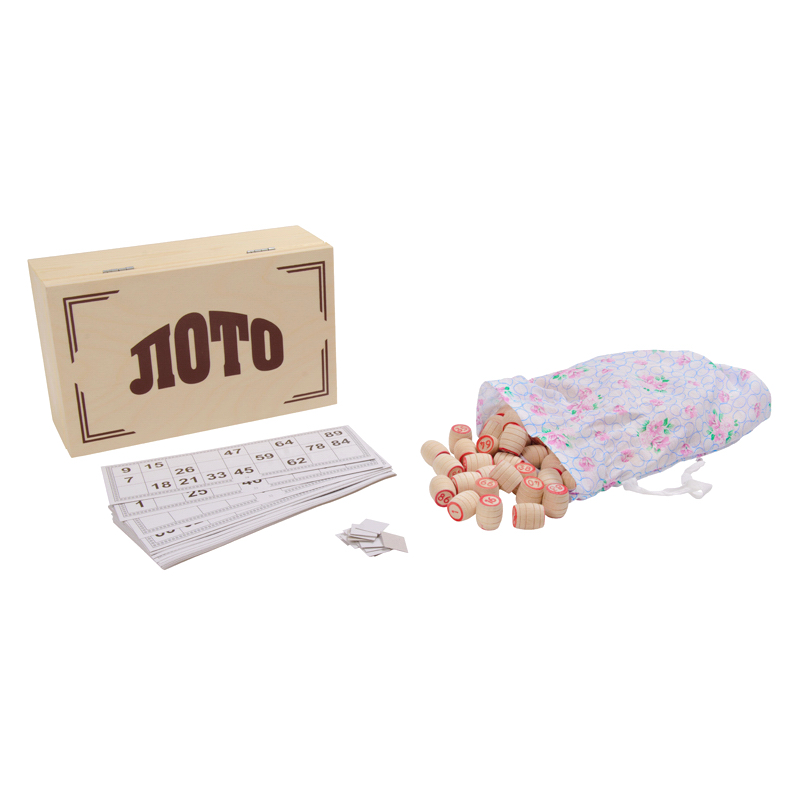 Задача игроков проста – накрыть все цифры в имеющейся карточке бочонками. Последние вынимаются из мешочка слепым методом, потом здесь невозможно шулерство. После объявления цифры игрок должен как можно быстрее отыскать ее у себя на карточке, после чего выкрикнуть ключевое слово. Первый, кто смог перекрыть все цифры на линии, или даже карточке становится победителем. Комплект бочонков, карточек и мешочек укладывается в деревянный бокс, который без труда можно брать с собой на пикники.