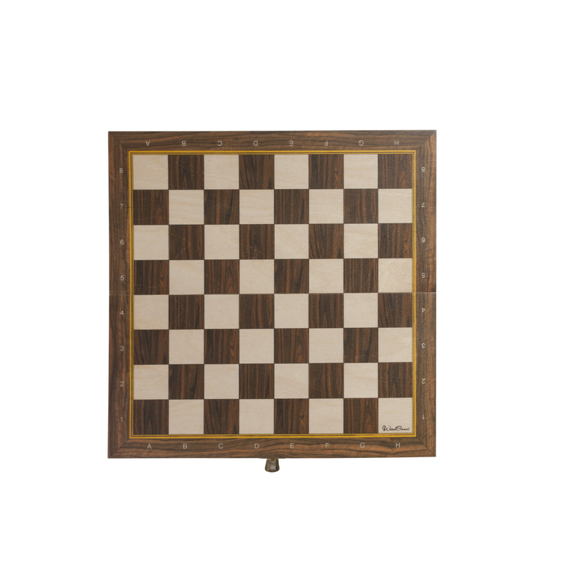 Доска и фигуры выполнены из массива бука. Его волнистая структура, хорошо заметная на тёмных клетках поля, является лучшим декоративным элементом. Доска складывается пополам, поэтому набор не займёт много места на полке. Простое и лаконичное исполнение позволит полностью сконцентрироваться на игре. Игральное поле покрыто лаком, который защищает поверхность от повреждений и создаёт лёгкое скольжение фигур.