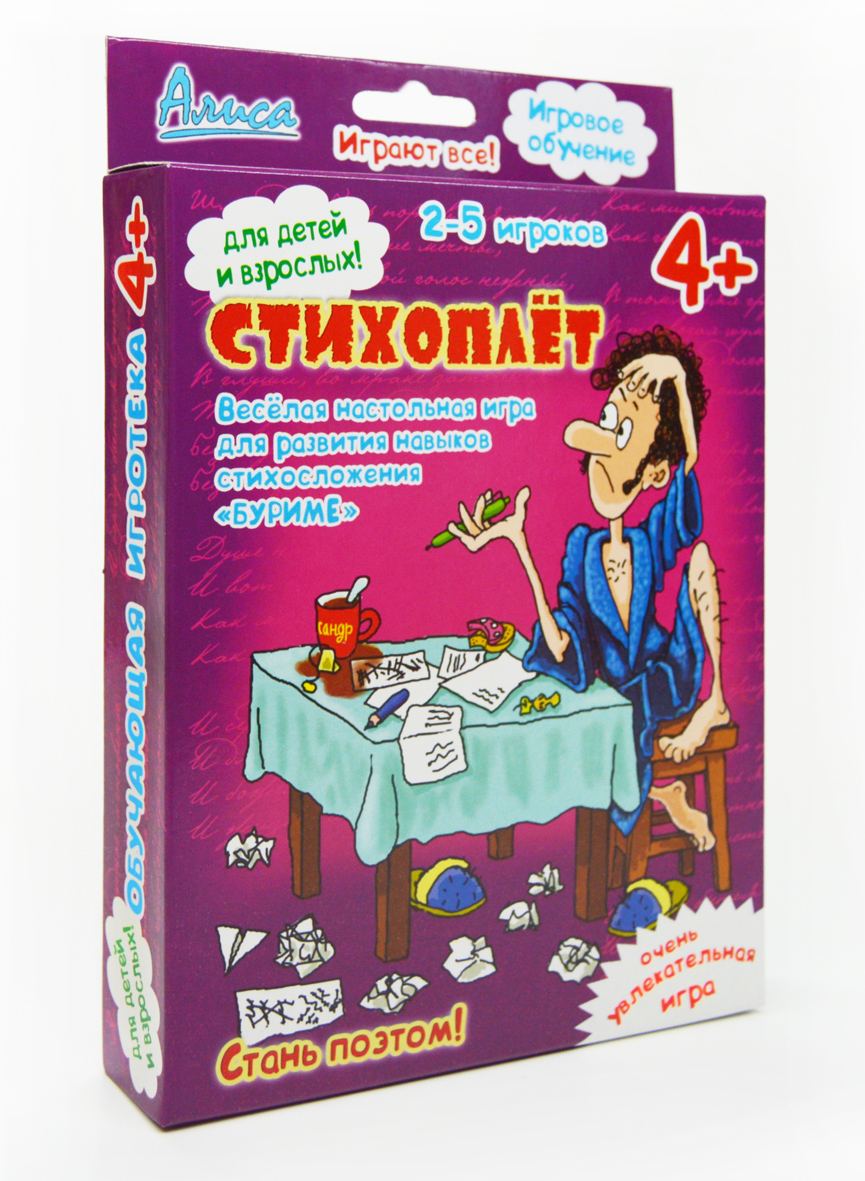 Это настольная игра по сложению стихов напоминает всем известную игру «БУРИМЕ». Направлена игра на развитие творческих способностей, остроумия, логики, абстрактного мышления, словарного запаса. Игра не только веселая и творческая, но и полезная для будущих маленьких писателей. Хотя и для взрослых она будет также интересна.