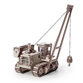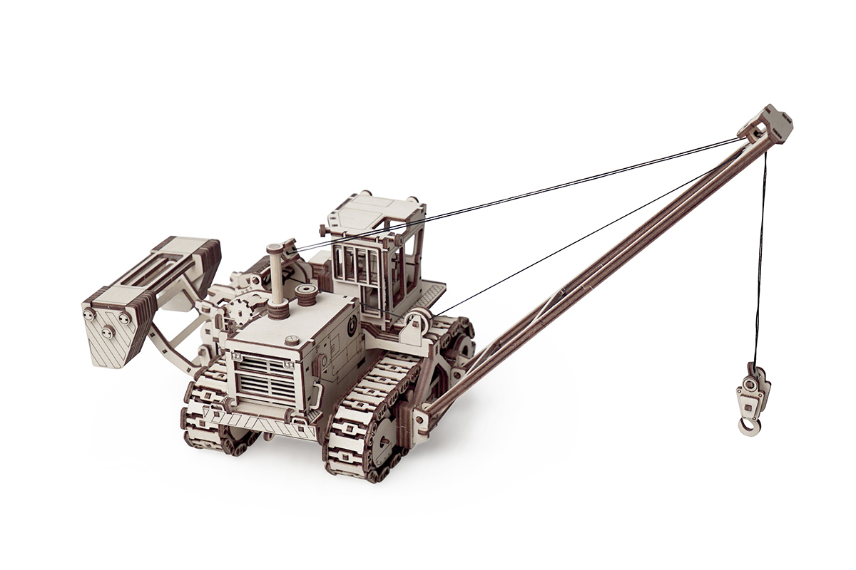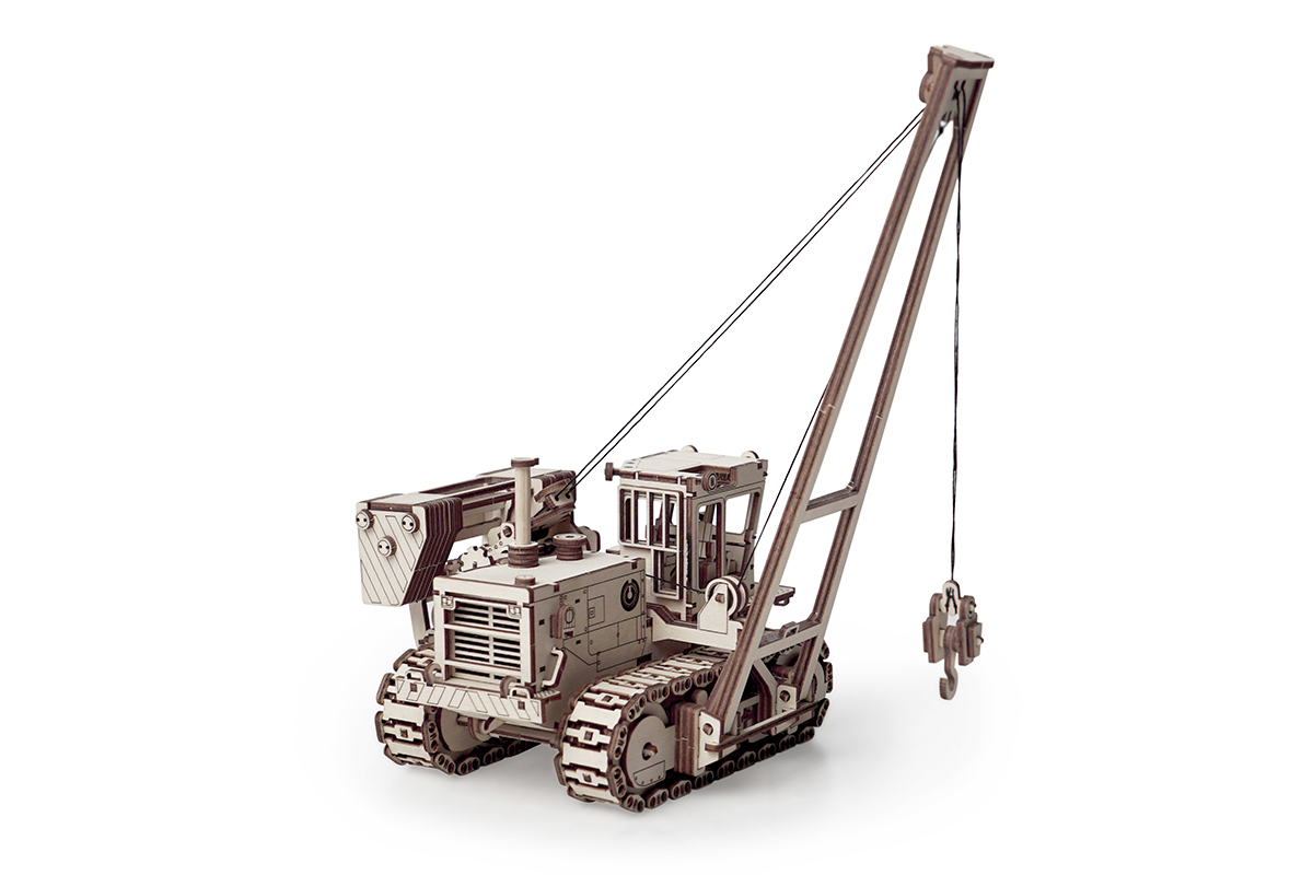 У собранной модели конструктора из дерева поднимается опускается стрела, противовес, вращаются гусеницы.